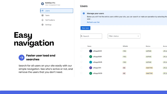 The first Runs on Atlassian bulk user management app for Jira, Jira Service Management and Confluence. Manage users, groups, and JSM organizations through a native Atlassian-style interface, reduce admin effort, and optimize license usage by removing inactive users.